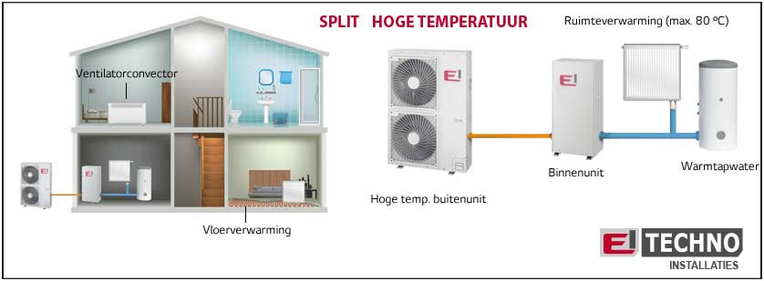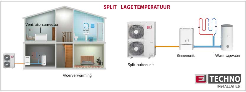 In tegenstelling tot het monoblock systeem wordt bij een split systeem een binnen- en buitenunit geplaatst met koelleidingen. Omdat het binnen en buitendeel verbonden is d.m.v. koelleiding met koelvloeistof is er weinig verlies op de leidingen naar buiten (i.v.m. koelvloeistof) en kan het buitendeel elders geplaatst worden (in de meeste gevallen op max.20meter ). Om dit systeem aan te mogen sluiten moet een bedrijf F-gassen gecertificeerd zijn (Stek-certificering). Eltechno is een F-gassen en STEK- gecertificeerd bedrijf waardoor wij alle montage- en onderhoudswerkzaamheden aan alle warmtepompen mogen verrichten.